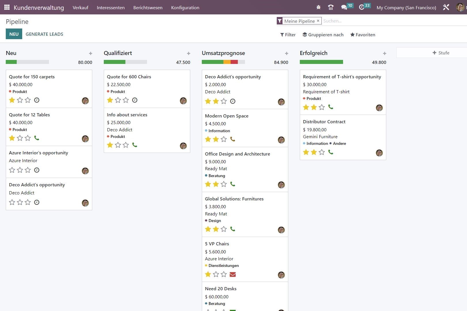 Mit Odoo kannst du zum Beispiel deine Kundenkontakte verwalten, Rechnungen erstellen, Projekte planen und verfolgen, E-Mails versenden, Marketing-Kampagnen durchführen und vieles mehr.
