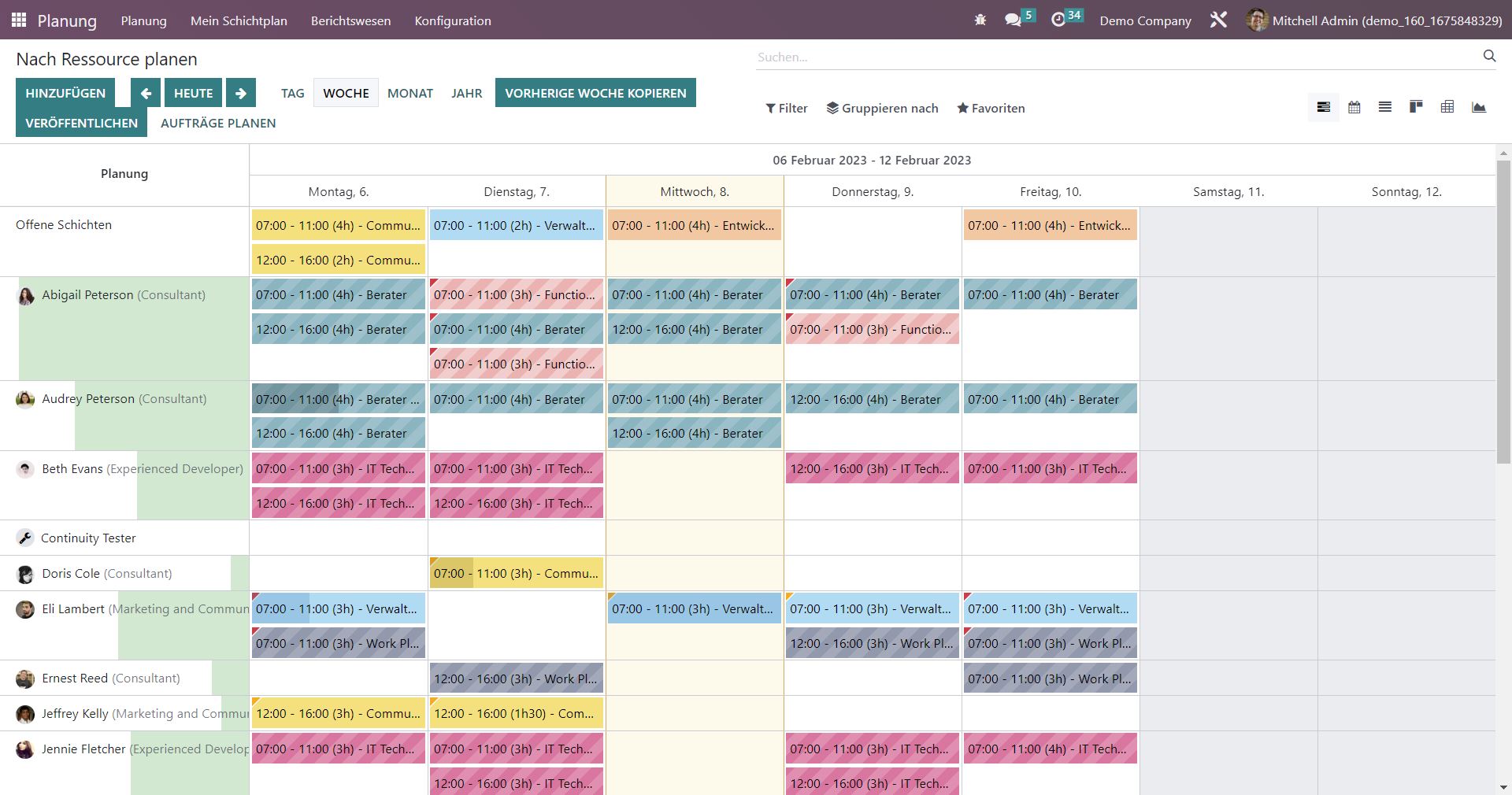Verleihe deiner Projektkoordination und -organisation Einfachheit mit dem Planungsmodul von Odoo. Verwalte die Zeitpläne deiner Mitarbeiter, prognostiziere Projekte und koordiniere Teams mit Leichtigkeit. Definiere unterschiedliche Arbeitszeiten und Schichten und weise sie einfach per Drag-and-drop deinen Mitarbeitern zu.